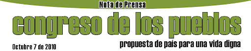 | Este miércoles 6 de octubre ha tenido lugar la rueda de prensa que convocaba a la instalación del Congreso de los Pueblos en la Universidad Nacional de Bogotá entre el 8 y el 12 de octubre de 2010. El Congreso de los Pueblos es un evento en el que las organizaciones convocantes esperan reunir unas 20.000 personas para legislar el futuro del país sin esperar una aprobación de los organismos e instancias estatales con el objetivo de presentar el espacio desde el cual «construir un escenario |